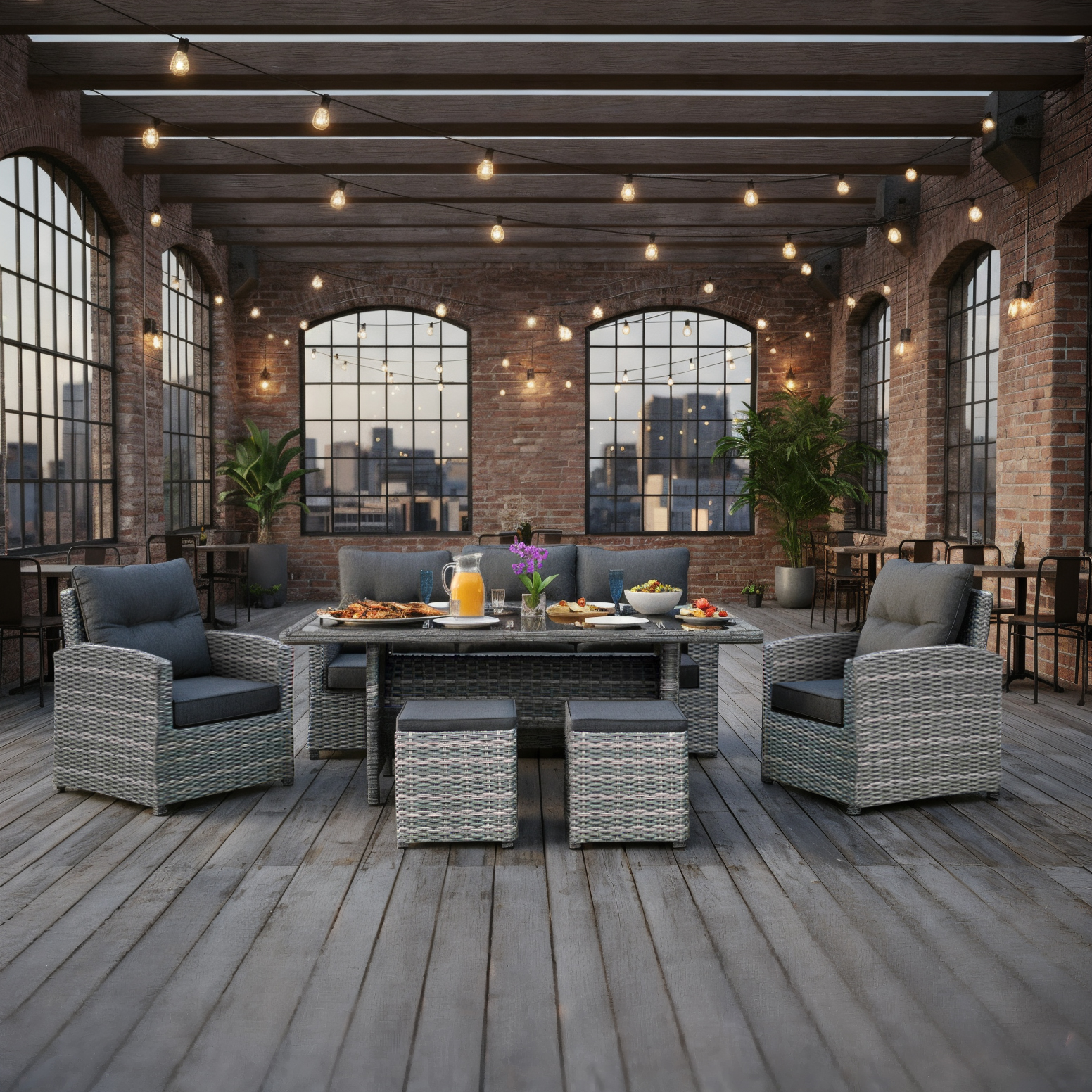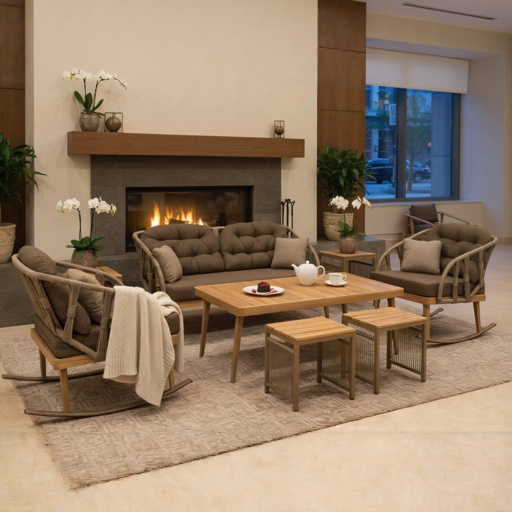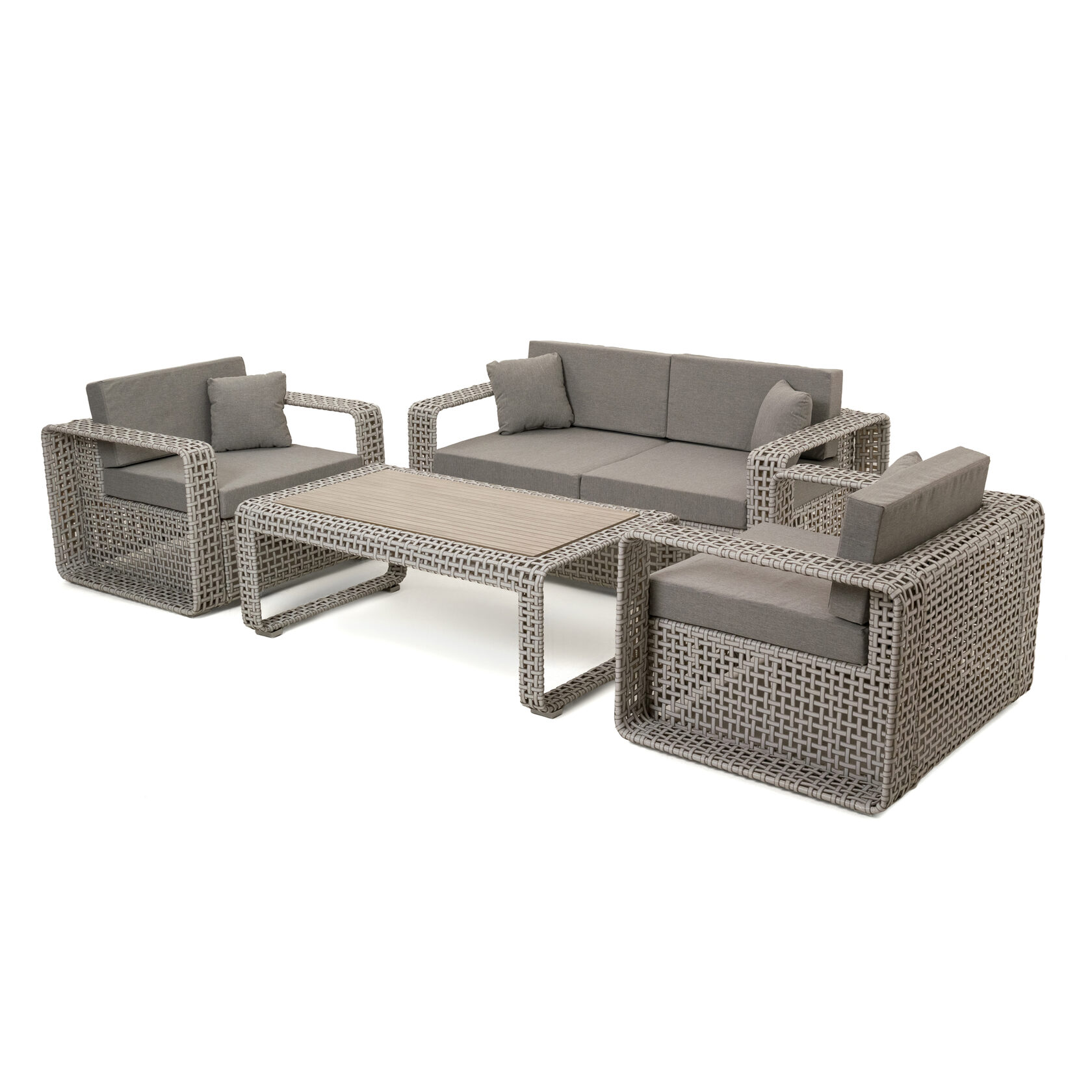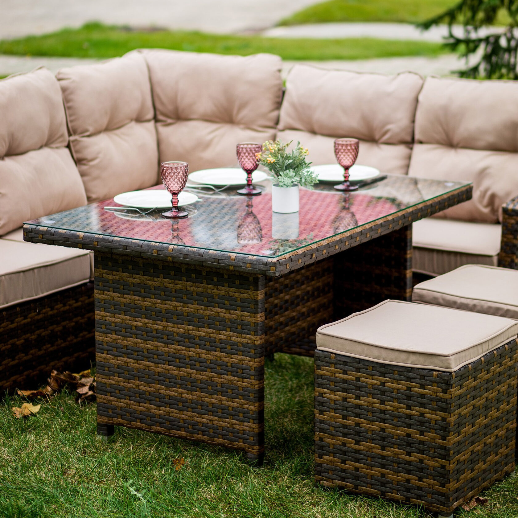 Использование премиального искусственного ротанга обеспечивает долговечность и устойчивость к различным погодным условиям. Элементы из натурального дерева добавляют теплоту и природное очарование. Дерево прекрасно сочетается с ротангом, усиливая общую эстетическую привлекательность. Стол отлично сочетается с набором мебели «Верона».