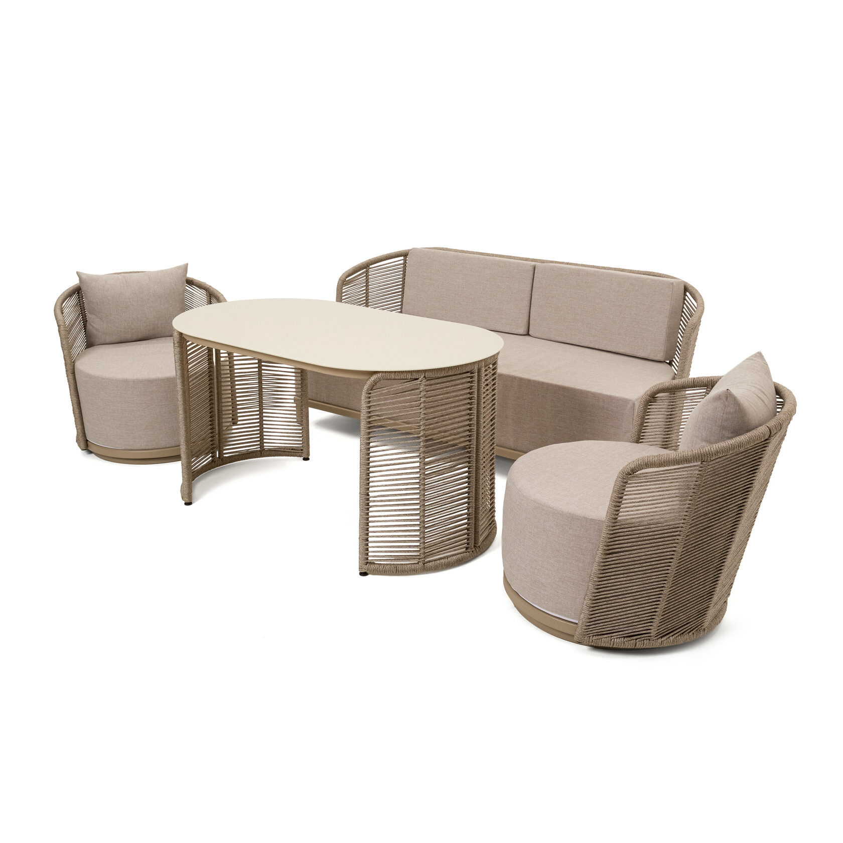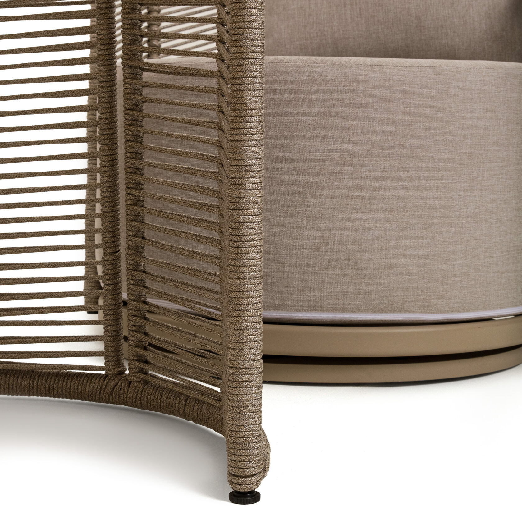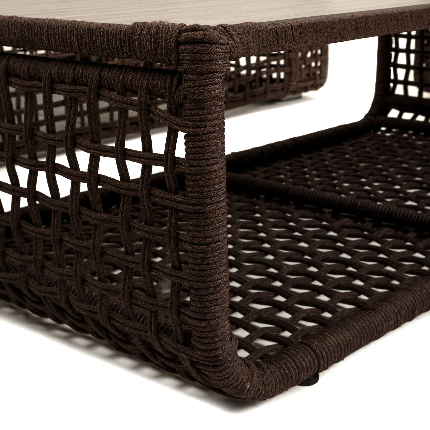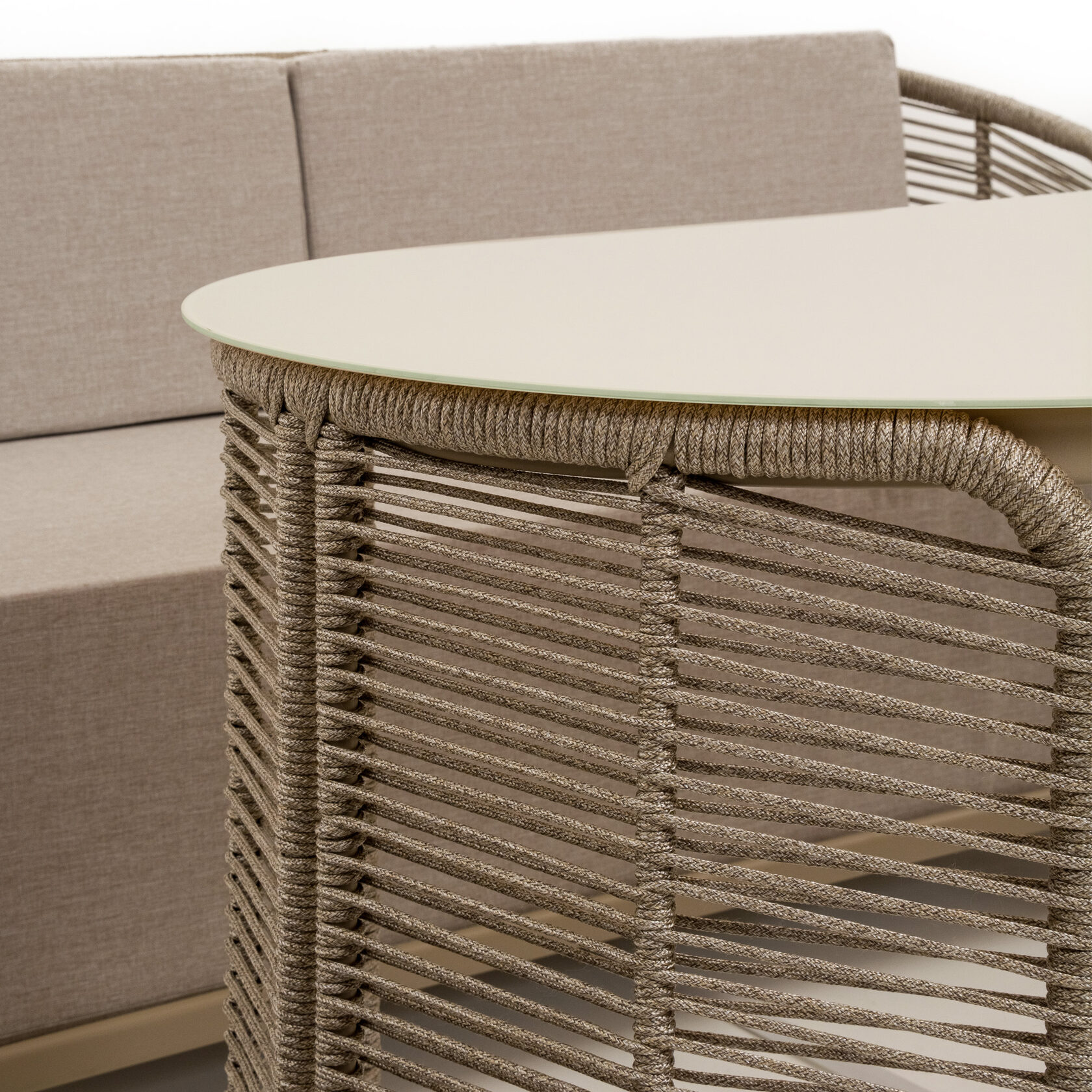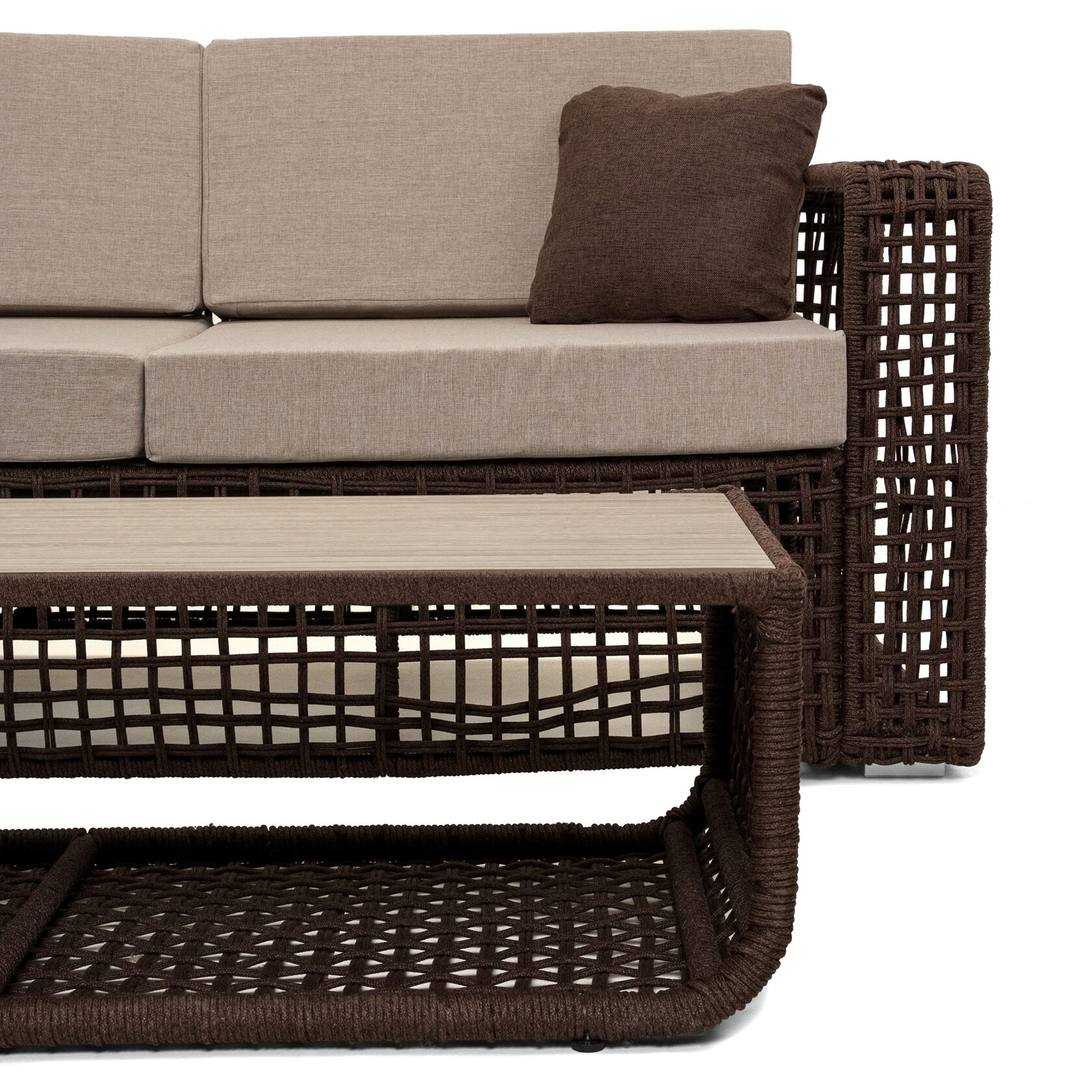 Мебель изготовлена на прочном стальном каркасе, который обеспечивает устойчивость и долговечность. Надёжная конструкция гарантирует долгий срок службы даже при интенсивной эксплуатации. Использование высококачественного синтетического волокна позволяет создать текстурированное и визуально привлекательное плетение, устойчивое к разным погодным условиям и регулярной чистке. Верёвка обеспечивает устойчивость к воздействию солнца и влаги, что делает мебель идеальной для помещений и открытых террас.