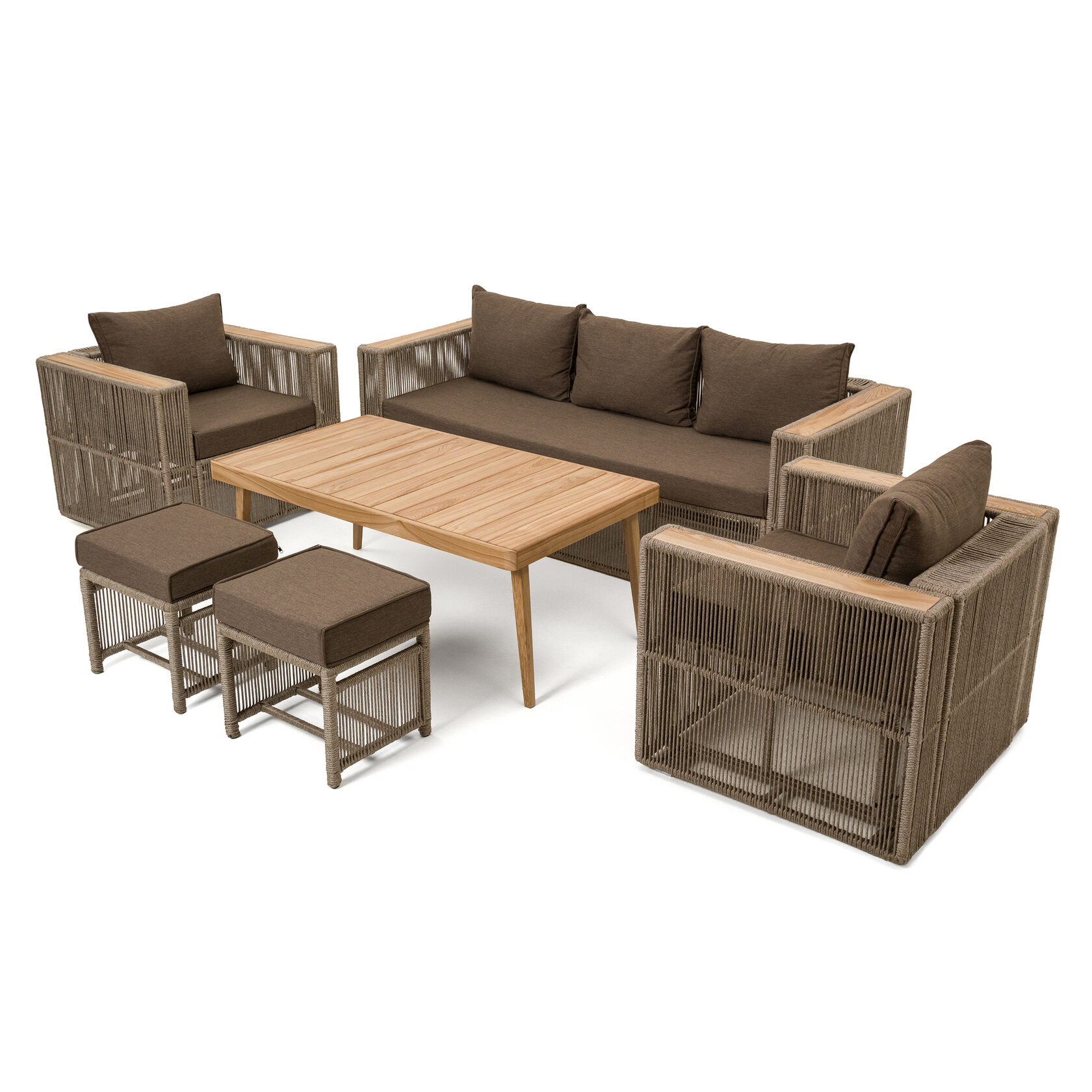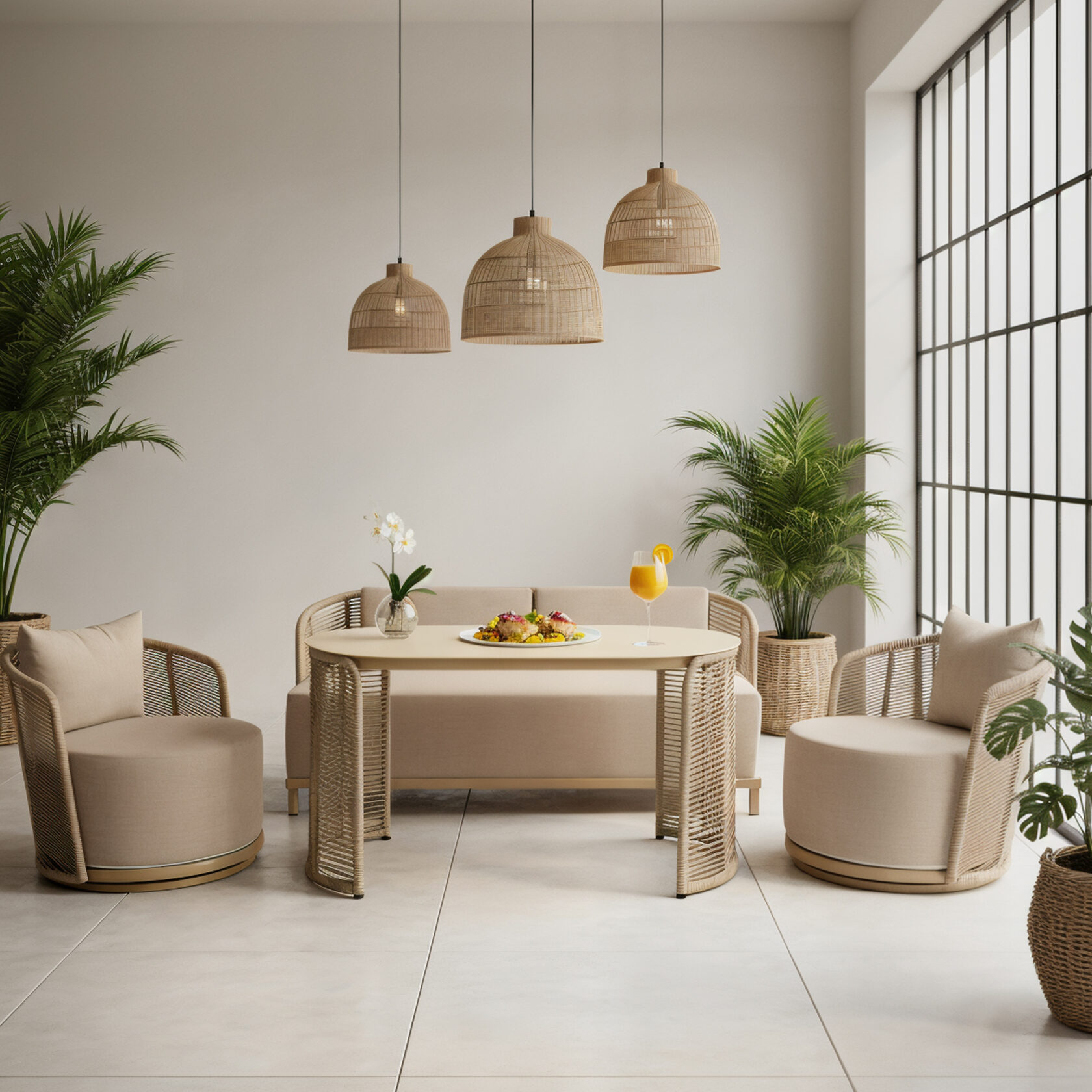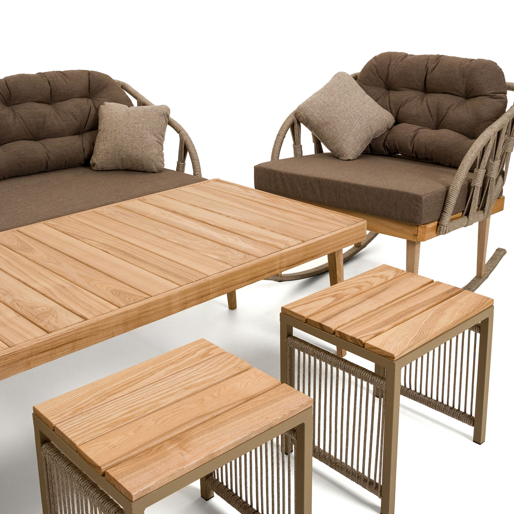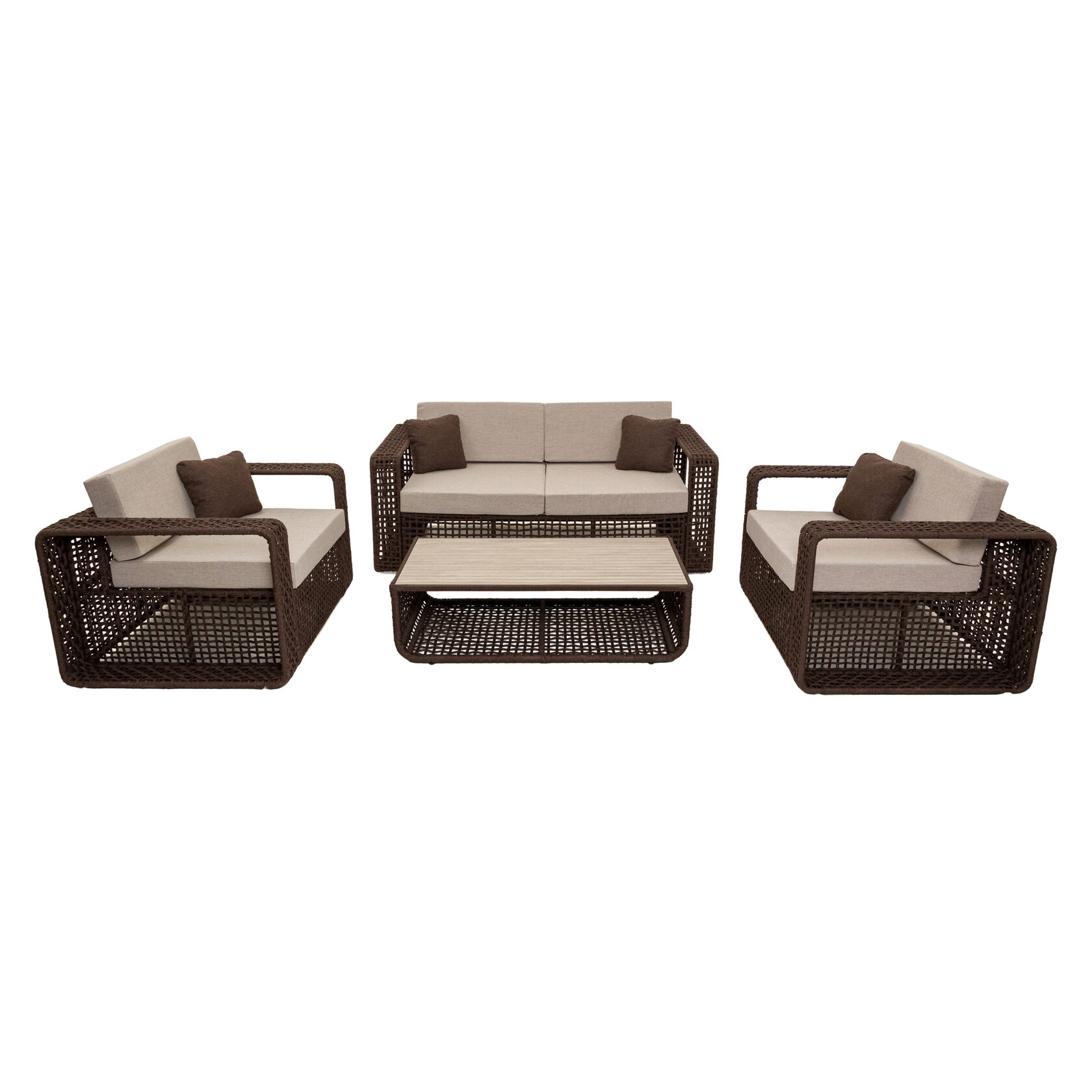 Мебель изготовлена на прочном стальном каркасе, который обеспечивает устойчивость и долговечность. Надёжная конструкция гарантирует долгий срок службы даже при интенсивной эксплуатации. Использование высококачественного синтетического волокна позволяет создать текстурированное и визуально привлекательное плетение, устойчивое к разным погодным условиям и регулярной чистке. Верёвка обеспечивает устойчивость к воздействию солнца и влаги, что делает мебель идеальной для помещений и открытых террас.
