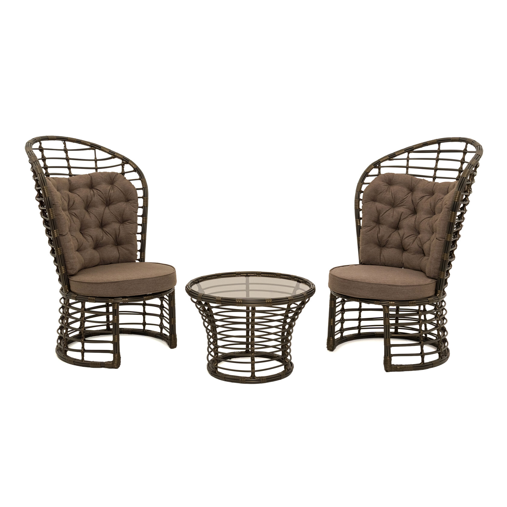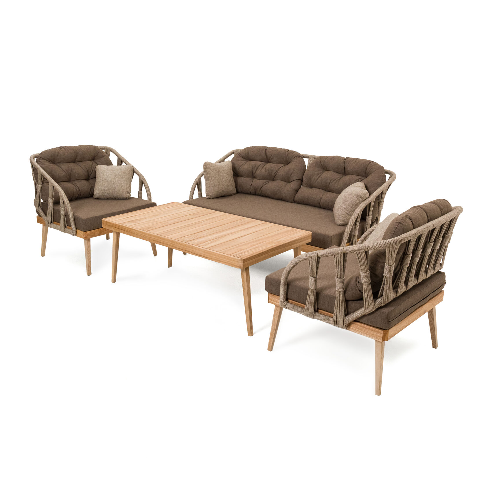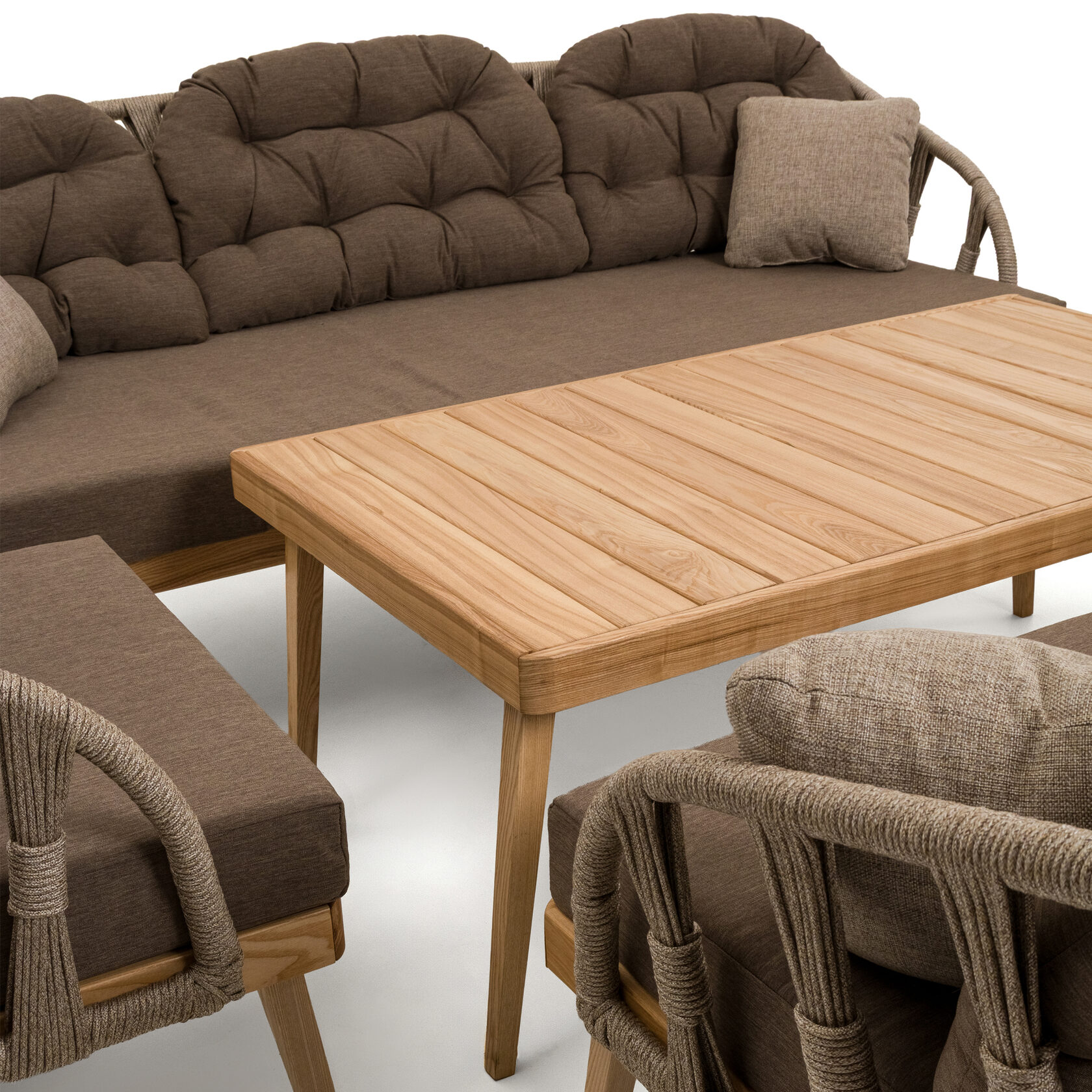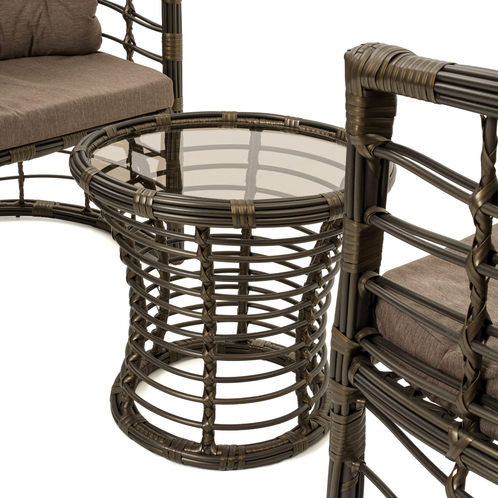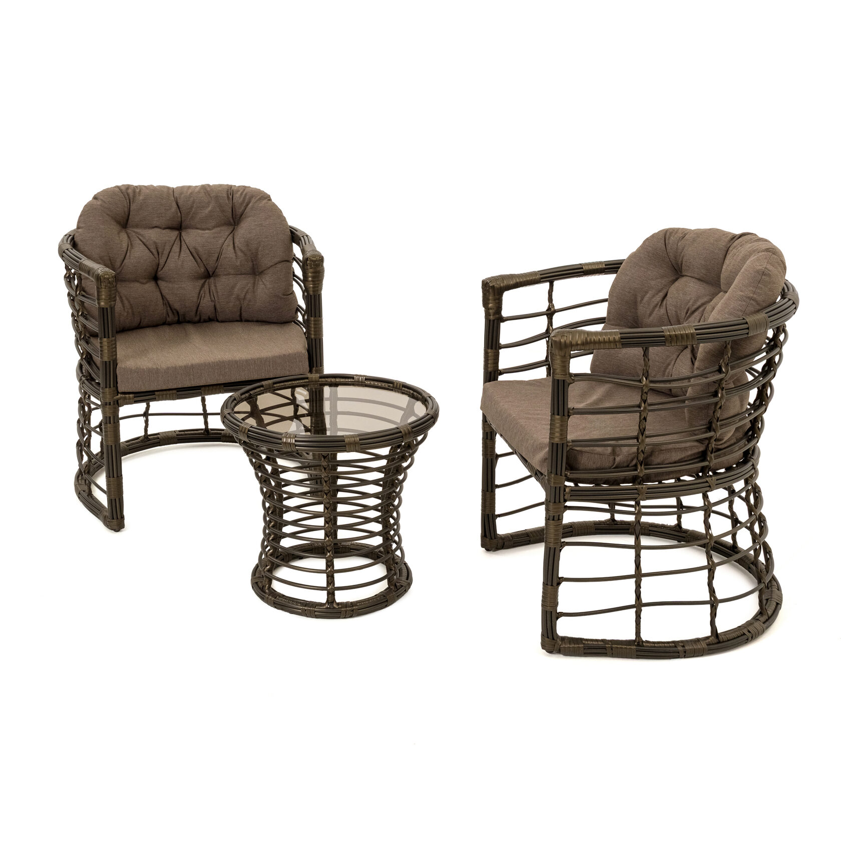Мебель изготовлена на прочном стальном каркасе, который обеспечивает устойчивость и долговечность. Надёжная конструкция гарантирует долгий срок службы даже при интенсивной эксплуатации. Использование высококачественного синтетического волокна позволяет создать текстурированное и визуально привлекательное плетение, устойчивое к разным погодным условиям и регулярной чистке. Верёвка обеспечивает устойчивость к воздействию солнца и влаги, что делает мебель идеальной для помещений и открытых террас.
