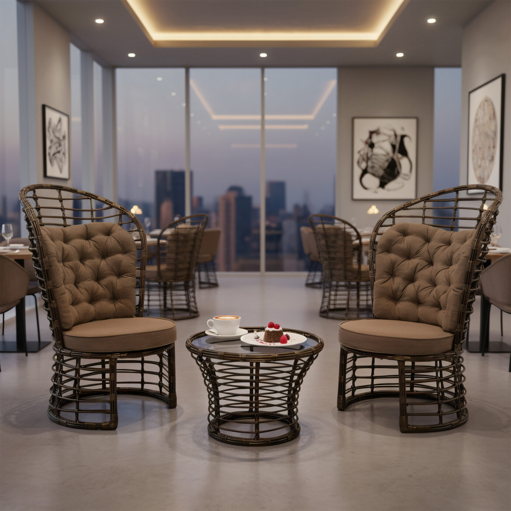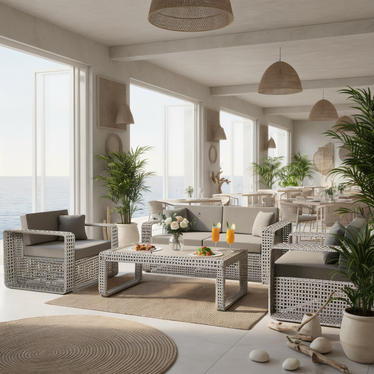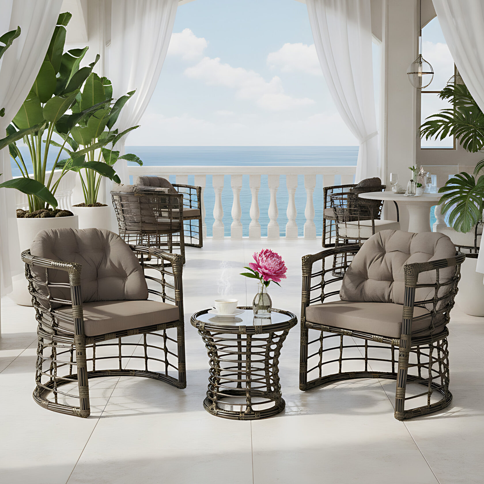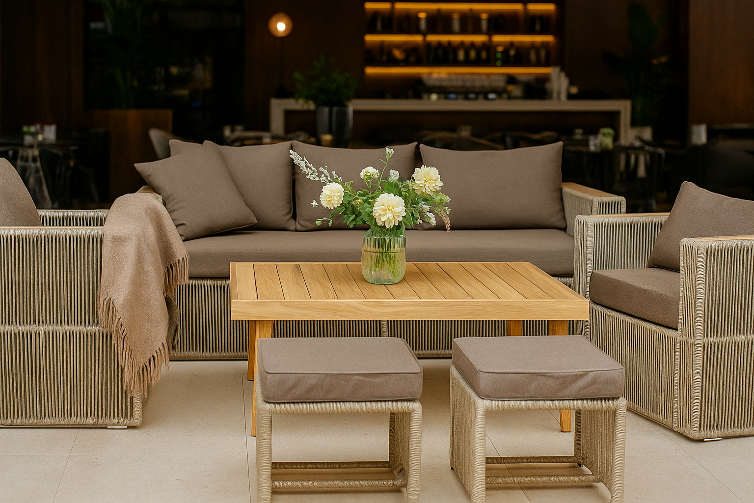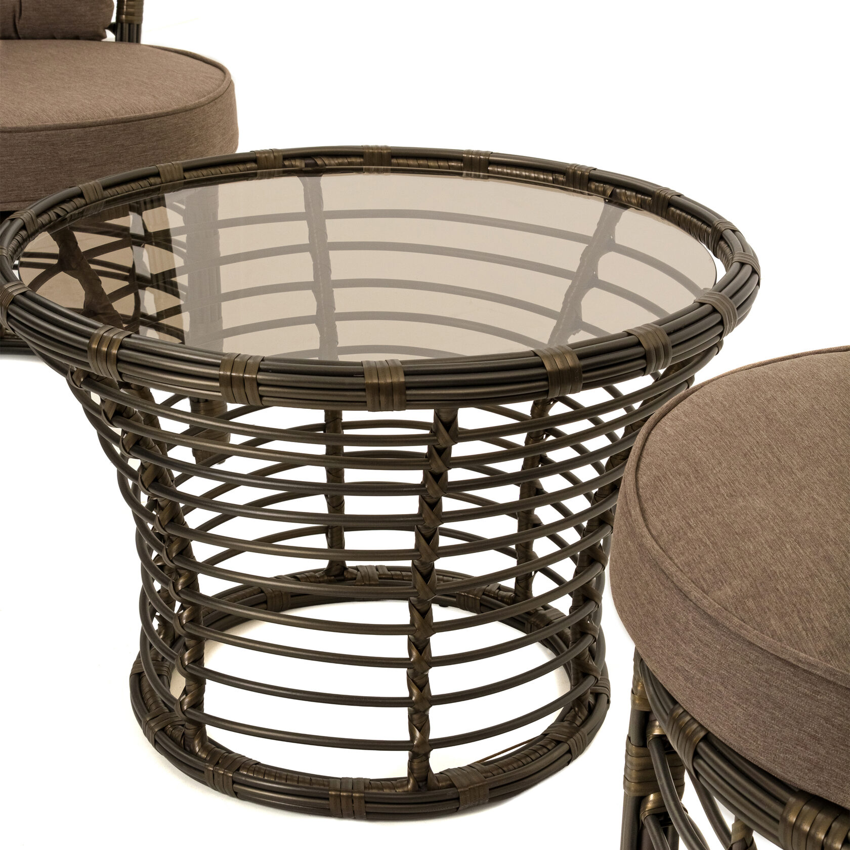 Мебель изготовлена на прочном стальном каркасе, который обеспечивает устойчивость и долговечность. Надёжная конструкция гарантирует долгий срок службы даже при интенсивной эксплуатации. Использование высококачественного синтетического волокна позволяет создать текстурированное и визуально привлекательное плетение, устойчивое к разным погодным условиям и регулярной чистке. Верёвка обеспечивает устойчивость к воздействию солнца и влаги, что делает мебель идеальной для помещений и открытых террас.