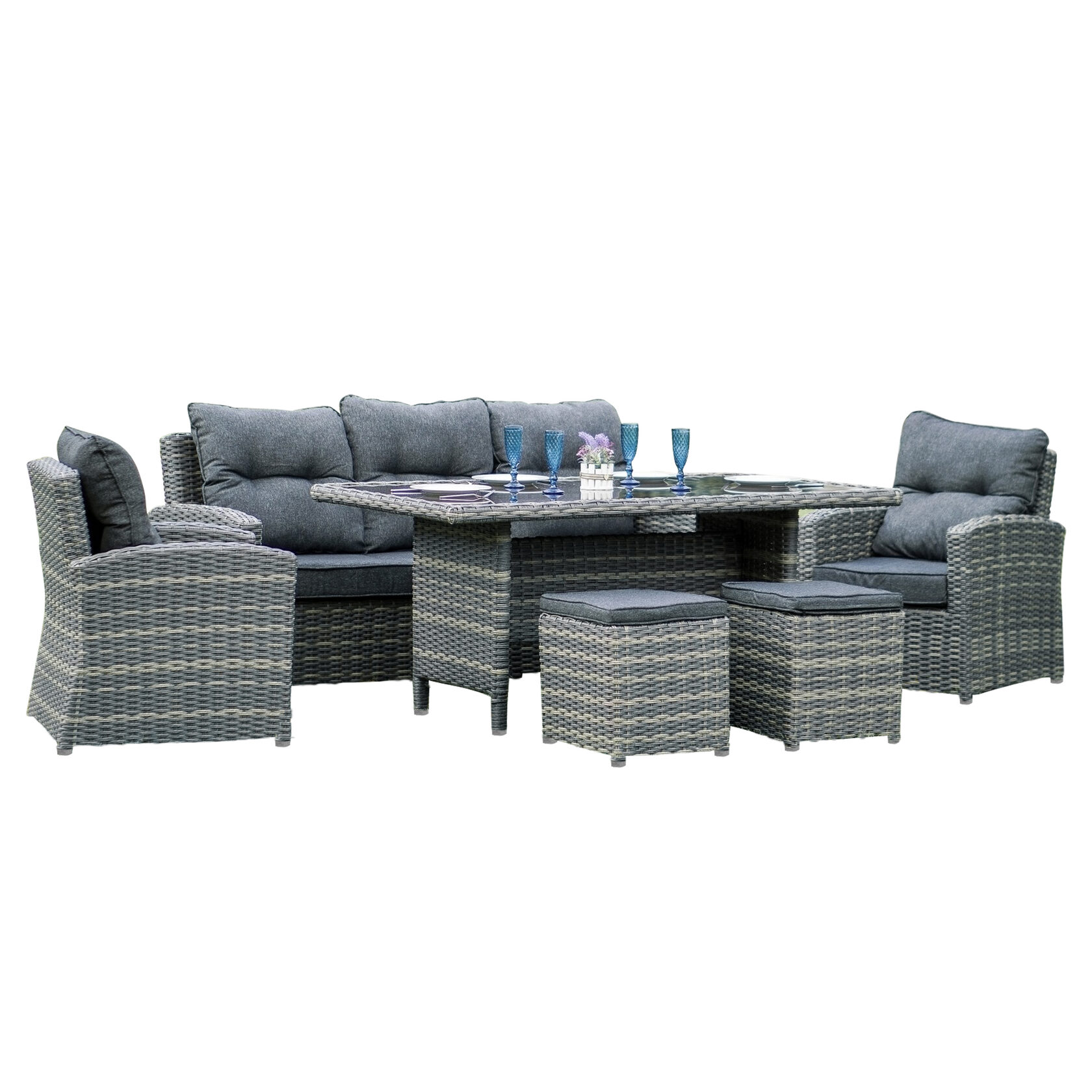 Мебель плетена из высококачественного искусственного ротанга, который стойко переносит воздействие солнечных лучей, влажности и перепадов температур. Он отличается долгим сроком службы и простотой в уходе, не теряет свой цвет и форму. Прочный стальной каркас обеспечивает надёжность и долговечность конструкции. Прочное стекло выдерживает нагрузку. Отлично сочетается с набором мебели «Ханой».